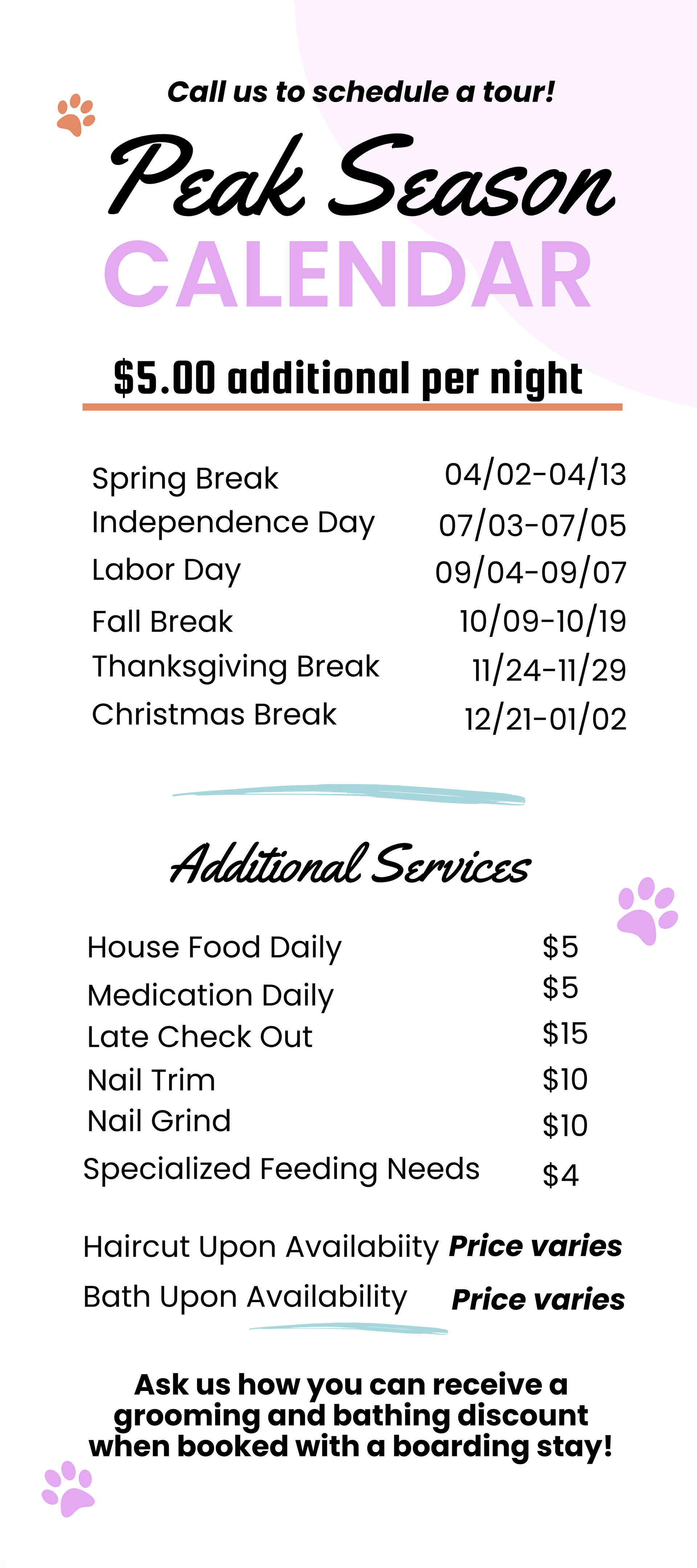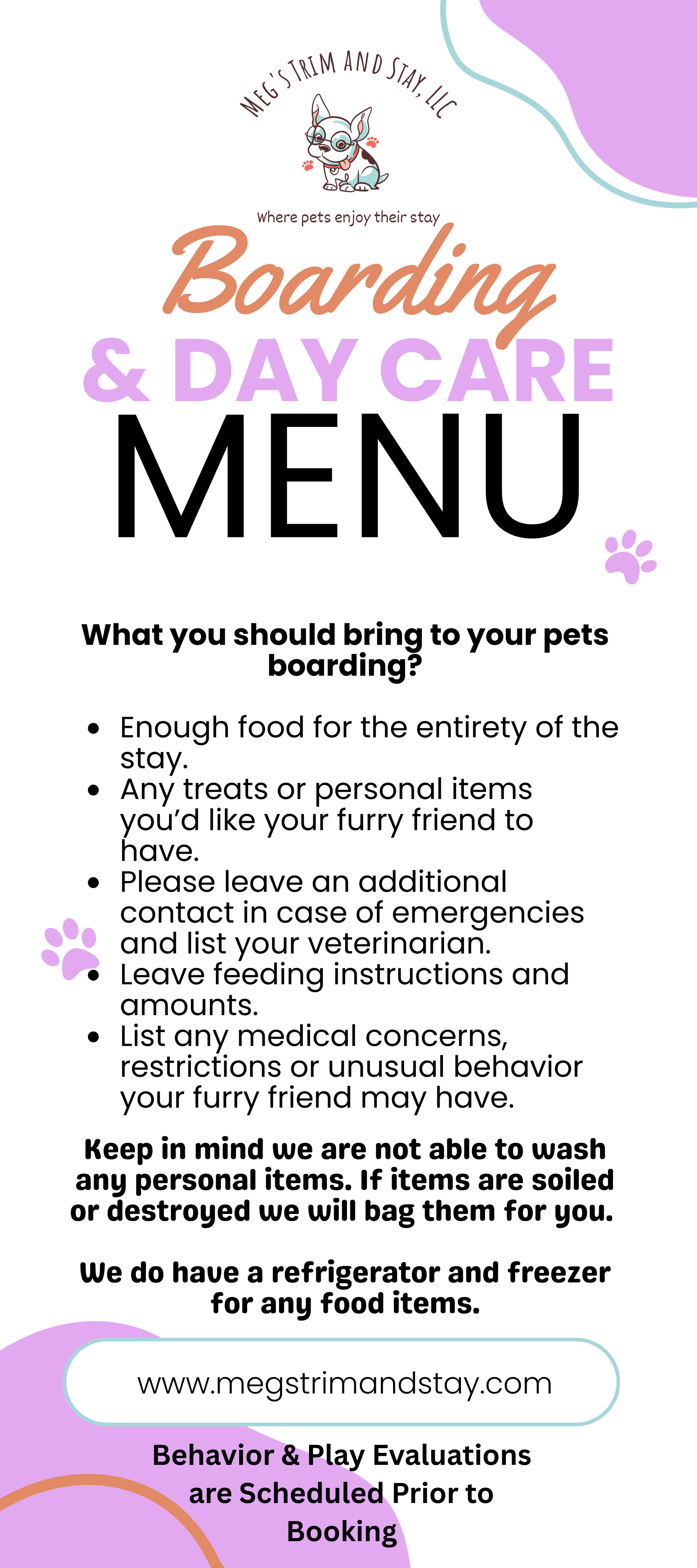 We do require all of our boarding guests to be vaccinated - including Bordetella, DHLPP and Rabies and pass a Temperament Assessment prior to staying over. We follow all veterinary procedures and recommended vaccinations. We also take boarding appointments for cats or pocket pets, such as guinea pigs and rabbits. Call 270-240-1900 today to reserve a spot for overnight boarding or to inquire about our weekend options.